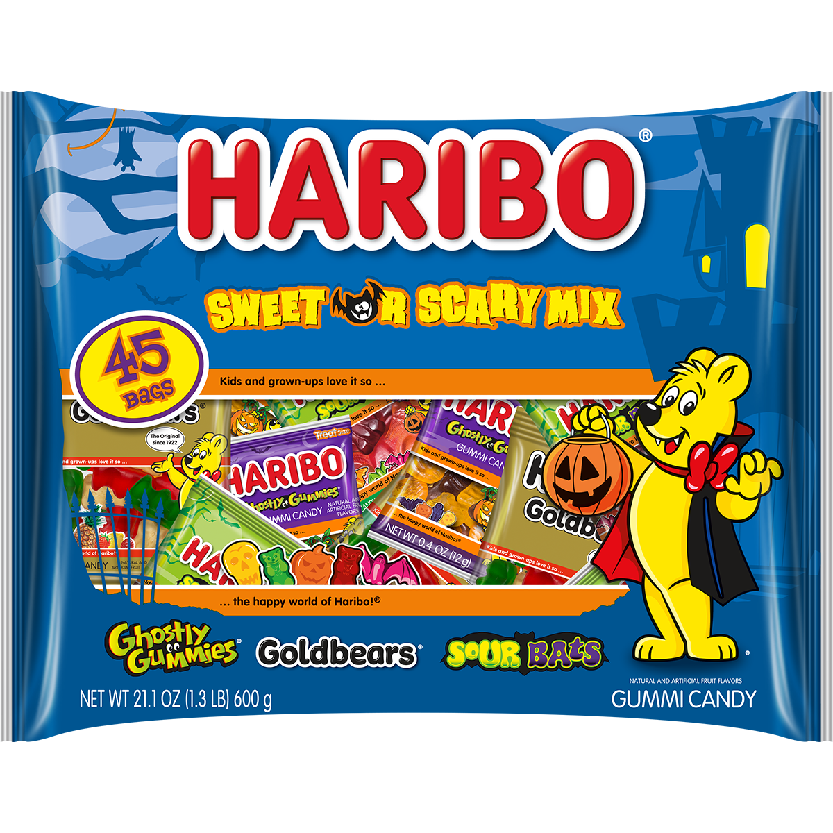 Assortment of treat-sized gummies: Goldbears, Ghostly Gummies and Sour Vampire Bats
