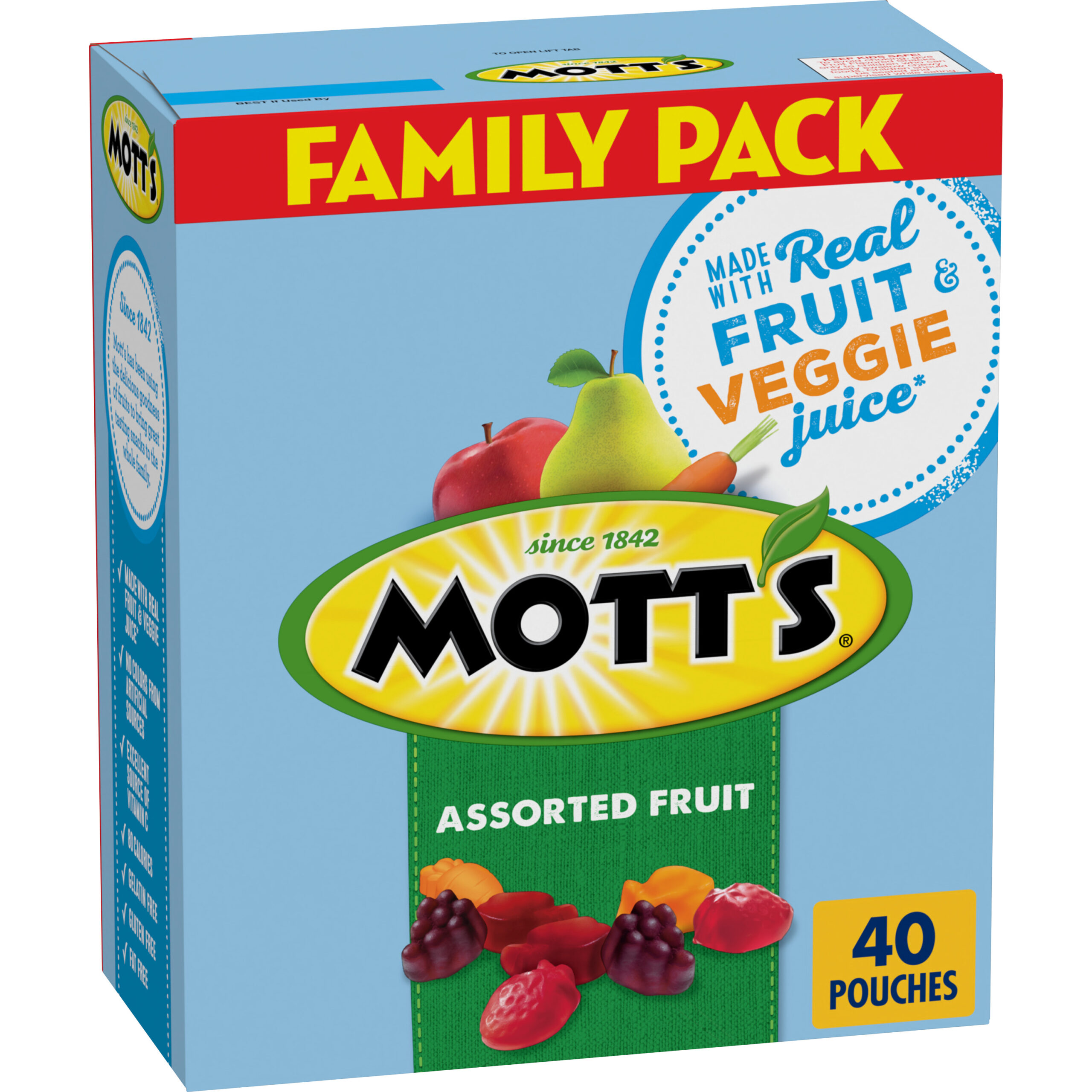 CONTAINS: One 32 oz Family Pack of Mott’s Assorted Fruit Flavored Snacks; 40 pouches